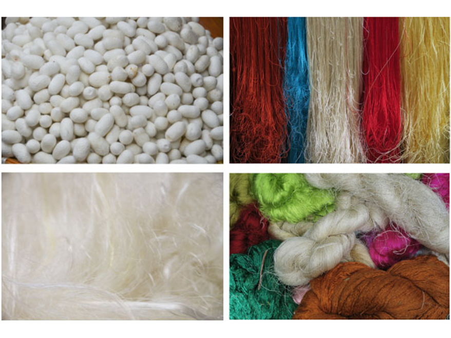 シルクは蚕(かいこ)が吐き出した糸で作った繭を原料とした天然繊維。繭糸を取り出し、撚り合わせて生糸(きいと)ができあがります。そのおもな成分はたんぱく質。その中でも主要な成分のフィブロインやセリシンがつながることで、シルク独特の光沢を生み出しています。