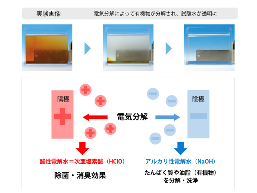 水を電気分解するときに生成される水溶液を電解水といいます。アルカリ性電解水がたんぱく質や油脂の汚れを洗浄。酸性電解水が残った菌を洗い流すことで除菌効果が生まれます。特に電解次亜塩素酸が除菌のポイント。医療現場や食品加工などの消毒に使用されており、その作用は証明済みです。
