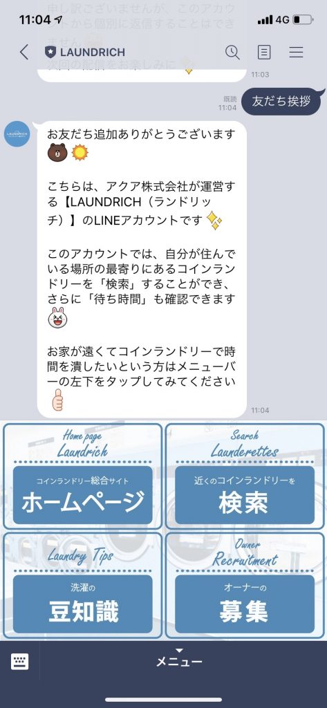 LAUNDRICH(ランドリッチ)LINEアカウントを友達登録することで、近くのコインランドリーの検索や、洗濯の豆知識、コインランドリーのオーナーになるまでの情報を確認することが出来ます。