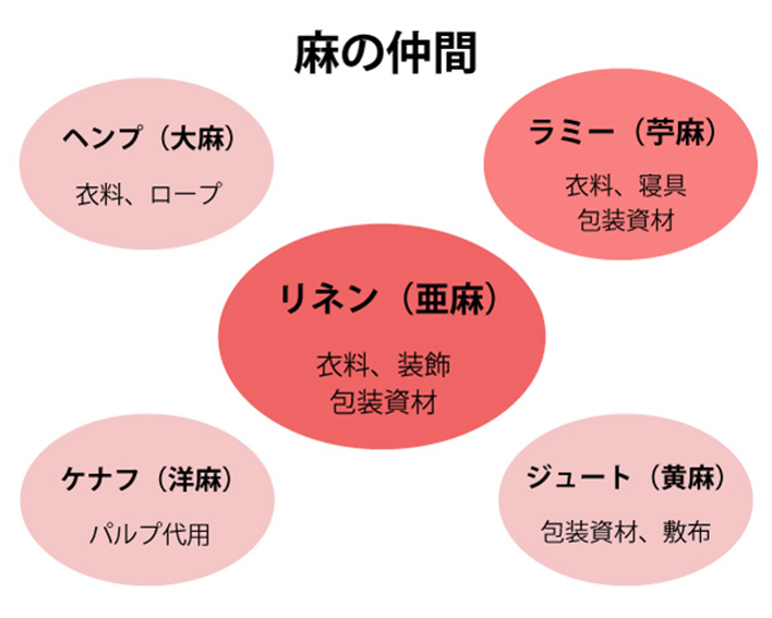 「麻」とは、植物に含まれている繊維の総称のこと。数十種にも及ぶそうですが、主なものはこちらの5種類になります。