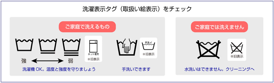 まずは洗濯表示タグ(取扱い絵表示)をチェックし、ご家庭での洗濯が可能かどうかを確かめましょう。ポリエステルの繊維自体はとても強いので、洗濯による磨耗については心配いりません。汚れを落ちやすくすることを心がけましょう。